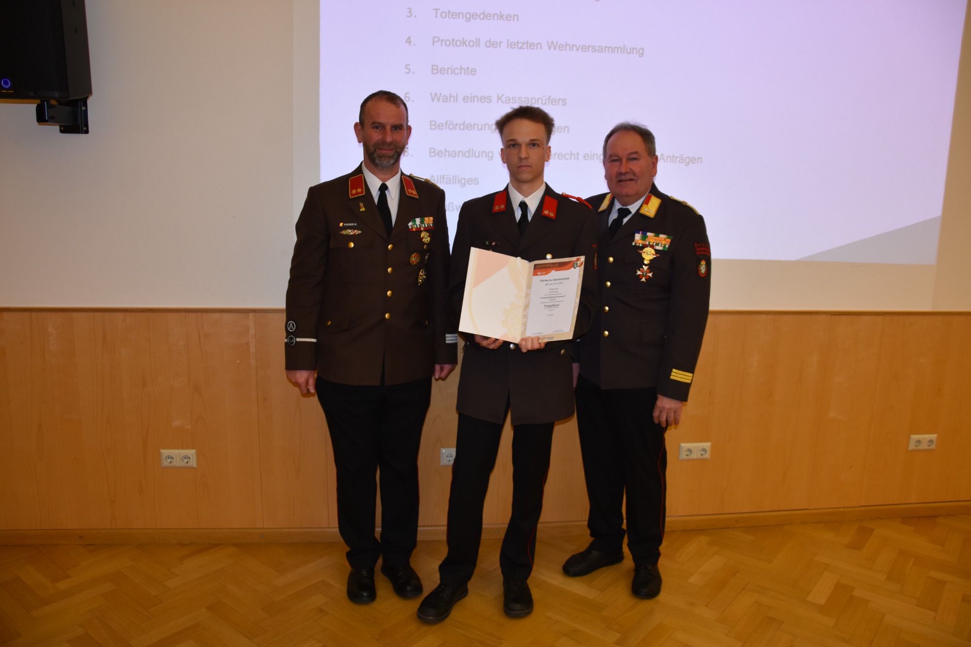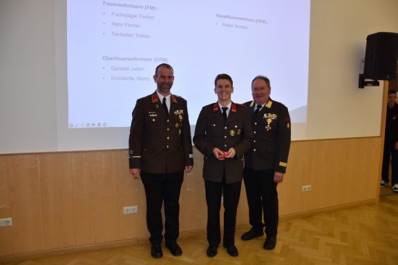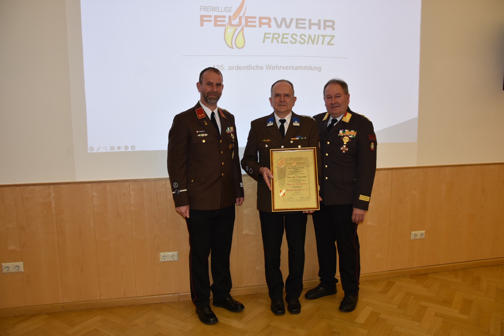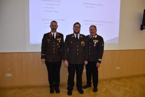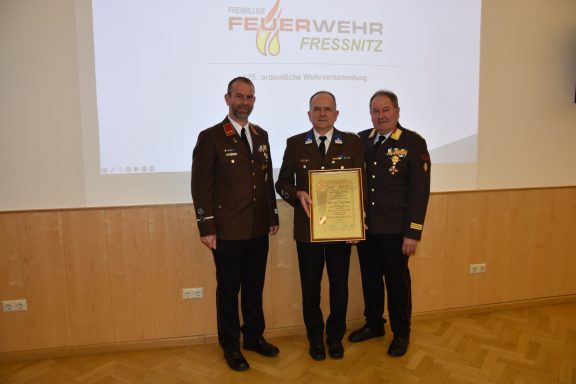 Die Wehrversammlung wird auch immer als würdiger Rahmen für Beförderungen und Auszeichnungen verdienter Kameradinnen und Kameraden genutzt. Besonders hervorzuheben ist die Ernennung von BM d.V. Albert Eder-Schützenhofer zum Ehren-Brandmeister der Verwaltung.